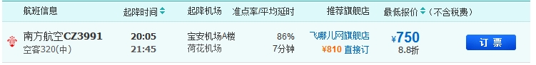 航班號:南方航空CZ3991