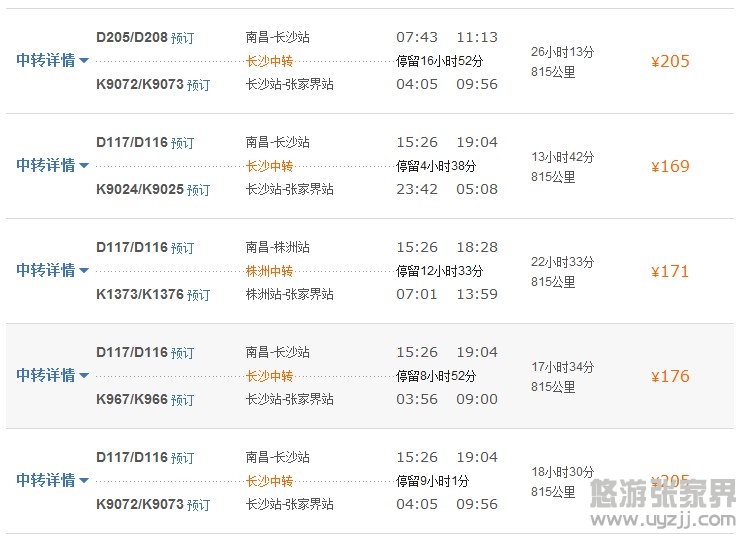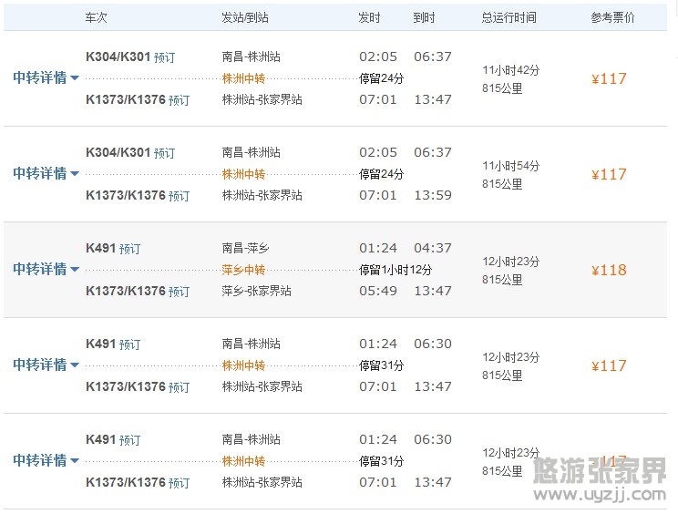 株洲中轉(zhuǎn)是最為好的中轉(zhuǎn)方式,株洲停留時間只需半個小時左右,從南昌坐火車到達(dá)株洲后即非常方便中轉(zhuǎn)到張家界,中轉(zhuǎn)車次如下圖: