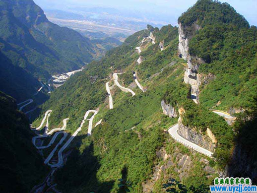 天門山盤山公路有“通天大道”之稱,盤山公路全長10.77公里,海拔從200米急劇提升到1300米,大道兩側(cè)絕壁千仞,空谷幽深,共計99個彎,180度急彎此消彼長,似玉帶環(huán)繞,彎彎緊連,層層疊起,直沖云霄。